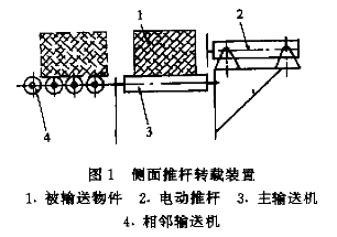 ①側(cè)面推桿轉(zhuǎn)載裝置如圖1所示,它主要是通過操縱往復(fù)式電動推桿2(或氣缸、液壓缸)推動被輸送物件1,使之離開主線輸送機(jī)3進(jìn)入相鄰分支輸送機(jī)4。該推桿轉(zhuǎn)載裝置結(jié)構(gòu)簡單,安裝方便。由于其工作方式是從物件側(cè)面推移,它的安裝方位隨相鄰輸送機(jī)的運行方向而定,且通常是安裝于主輸送機(jī)的側(cè)面,只需較小的地面空間。其缺點是因為它直接將物件從側(cè)面推入與主線輸送機(jī)呈90轉(zhuǎn)角的鄰近輸送機(jī)上.只適于物件作直角轉(zhuǎn)向,且不適于易碎、怕擠壓的物件。這種轉(zhuǎn)載裝置適用于輸送多種外形尺寸或重量范圍變化較大的物件。