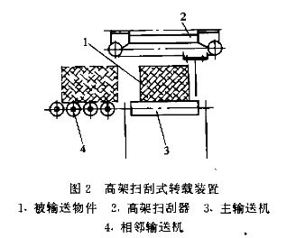 ②高架掃刮式轉(zhuǎn)載裝置其配置形式如圖2所示,工作方式類似于推桿轉(zhuǎn)載裝置,只是這種轉(zhuǎn)載裝置是安裝在滾筒輸送機(jī)的上方,通稱為高架掃刮器,利用氣缸或液壓缸在主輸送機(jī)3上方橫向往復(fù)運動,帶動刮板將物件1從主線輸送機(jī)側(cè)向移開。它能把被輸送的物件從任意側(cè)轉(zhuǎn)移到鄰近的輸送機(jī)4上。這種轉(zhuǎn)載裝置的安裝僅占用主輸送機(jī)上方的一個較小空間,而不占用地面位置。其輸送物件范圍與前述推桿式轉(zhuǎn)載裝置相同。