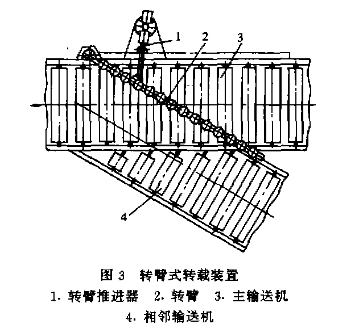這是一種簡單的機(jī)械式轉(zhuǎn)載裝置配置形式如圖3所示,轉(zhuǎn)臂2可在主輸送機(jī)3上方轉(zhuǎn)動。當(dāng)處于轉(zhuǎn)載位置時,可將滾筒輸送機(jī)上的物件阻擋,使之改變運行方向進(jìn)入鄰近的分支輸送機(jī)4,也可使轉(zhuǎn)臂2讓開主輸?shù)鼨C(jī)上的通道,使被輸送物件繼續(xù)留在主輸送機(jī)上向前運行。為減小轉(zhuǎn)臂阻擋物件所產(chǎn)生的摩擦阻力,一般在接觸側(cè)加裝導(dǎo)向輥子轉(zhuǎn)臂的操縱可以用手動,更多的是借助于氣缸或液壓缸進(jìn)行操縱。這種轉(zhuǎn)載裝置可以保證物件轉(zhuǎn)到鄰近輸送機(jī)后不改變運行方向,這一點對于必須保持物件朝向的場合是非常重要的。這種轉(zhuǎn)載裝置只適宜于有較好導(dǎo)向側(cè)面的物件。