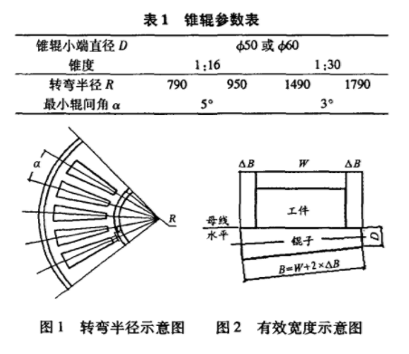 (5)轉(zhuǎn)彎段機(jī)架內(nèi)側(cè)半徑R,mm;規(guī)定由以下條件決定如圖1和表1所示。